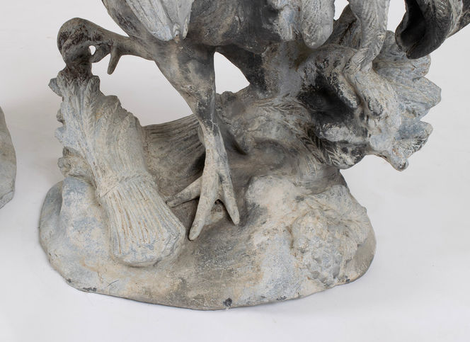 Pair of lead roosters, each crowing with a claw on a sheaf of wheat. Probably made by H. Crowther, London.