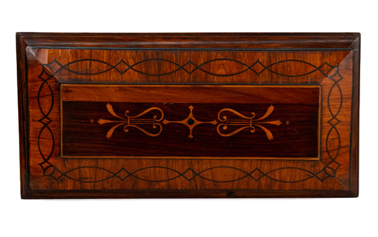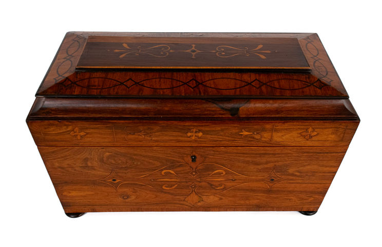 Regency kingwood sarcophagus tea caddy, the top, front and sides inlaid with lyres, palmettes and geometric stringing, the interior fitted with cannisters with similar inlay and cut crystal mixing bowl. England, c. 1810.
