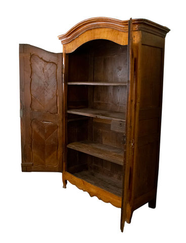 Fruitwood armoire of fine color and patina with an arched bonnet over two doors with steel hardware and shaped panels inset with wide herringbone planks over a shaped apron joined by short cabriole legs. France. Early 19th C.
